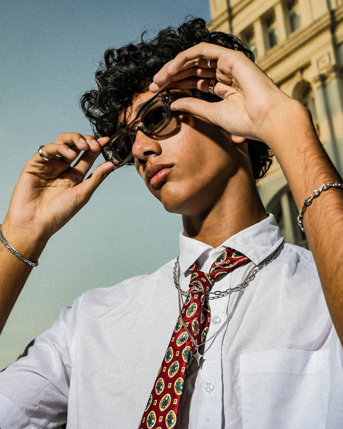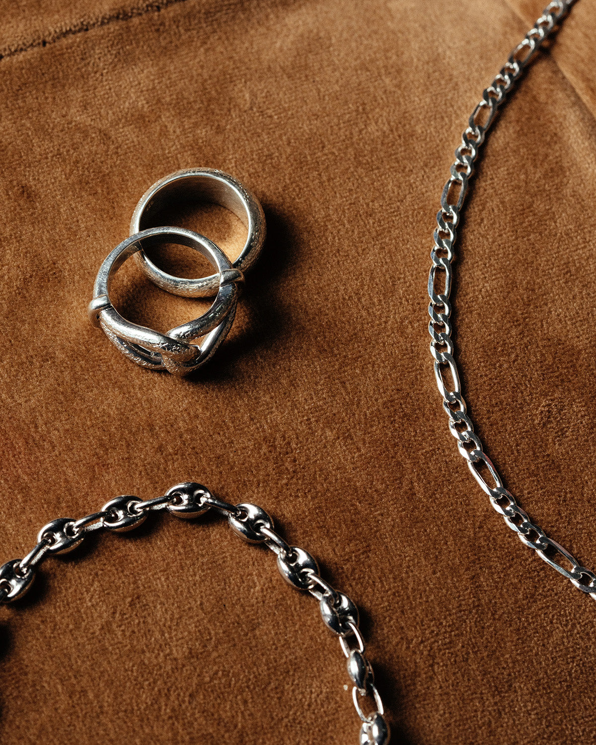 A bold chain with solid, anchor-style links that create a strong, structured look along the neckline. The defined link shape gives it a more industrial, grounded character, making it ideal as a standalone piece. A modern unisex design that brings weight and attitude without feeling excessive.